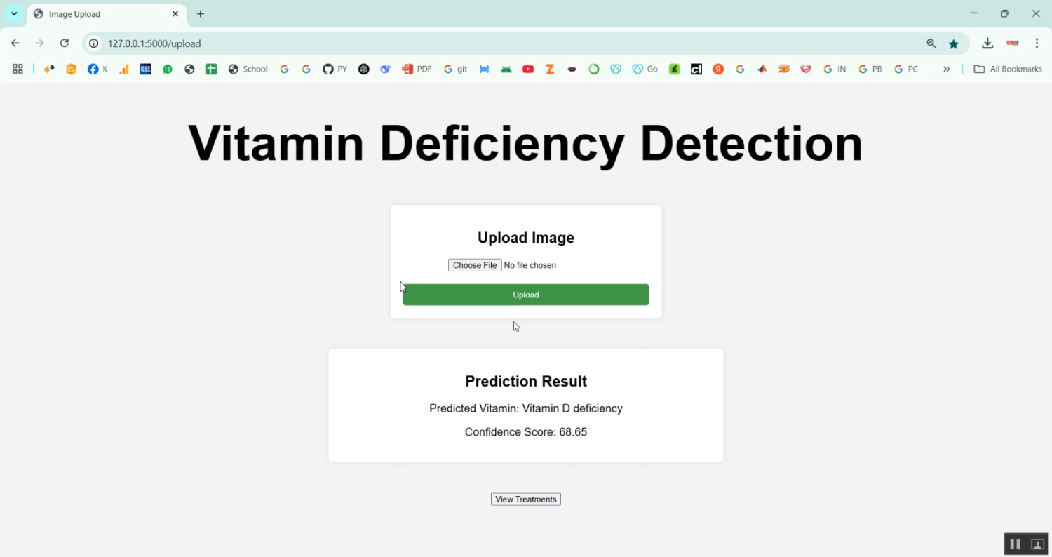 The proposed system introduces a Python-based framework for vitamin deficiency detection using image processing and deep learning techniques. Images of the subject’s skin, eyes, or nails are captured and preprocessed with techniques such as resizing, noise removal, contrast enhancement, and normalization. Convolutional Neural Networks (CNNs) are trained on labeled datasets to identify visual indicators of vitamin deficiencies, such as pale skin, yellowing of eyes, or brittle nails. The system evaluates its performance using metrics such as accuracy, precision, recall, F1-score, and confusion matrices. By combining automated image analysis with deep learning classification, the system provides a scalable, reliable, and efficient solution for early detection of vitamin deficiencies, supporting preventive healthcare and reducing the risk of related health complications.
