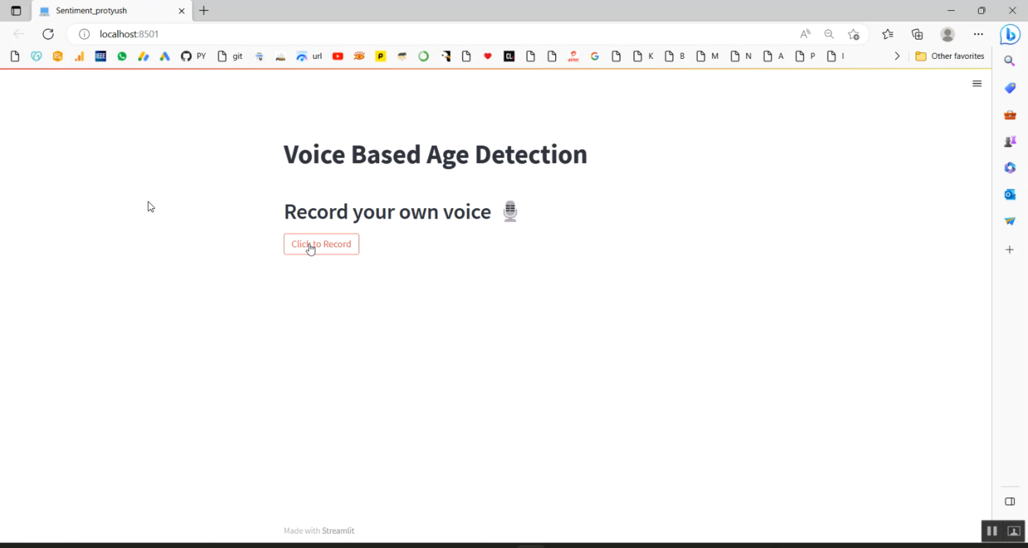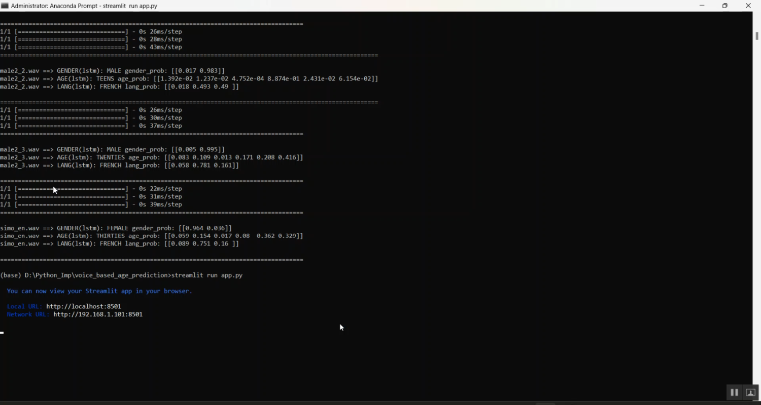 The proposed system implements a Python-based machine learning framework for voice-based age prediction, integrated with a Streamlit web interface for user interaction. Voice samples are collected and preprocessed for noise reduction and normalization. Audio feature extraction techniques such as MFCCs, pitch, formants, and energy are applied to create a feature set suitable for machine learning models. Supervised models like Random Forest, Gradient Boosting, or SVM are trained on labeled datasets to predict the speaker’s age. The Streamlit interface allows users to upload voice recordings, view predicted age, and explore visualizations of extracted features. By combining audio feature analysis, machine learning, and interactive web deployment, the system provides an accurate, scalable, and user-friendly solution for age prediction from voice recordings.