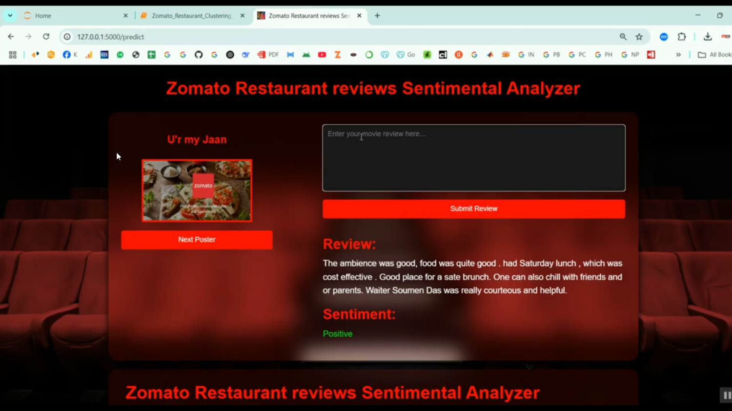 The proposed system introduces a Python-based framework for Zomato restaurant review sentiment analysis using NLP and machine learning techniques. Text preprocessing includes tokenization, stop-word removal, lemmatization, and vectorization using methods such as TF-IDF, Word2Vec, or transformer-based embeddings like BERT. Machine learning models such as Random Forest, Support Vector Machines (SVM), or deep learning models including LSTM, CNN, or hybrid architectures are trained to classify reviews into positive, negative, or neutral sentiments. The system evaluates model performance using metrics like accuracy, precision, recall, F1-score, and confusion matrices. By integrating advanced NLP techniques and predictive modeling, the system provides a scalable, automated, and accurate solution for analyzing customer sentiment, enabling restaurant owners to make data-driven decisions, enhance service quality, and improve customer experience.